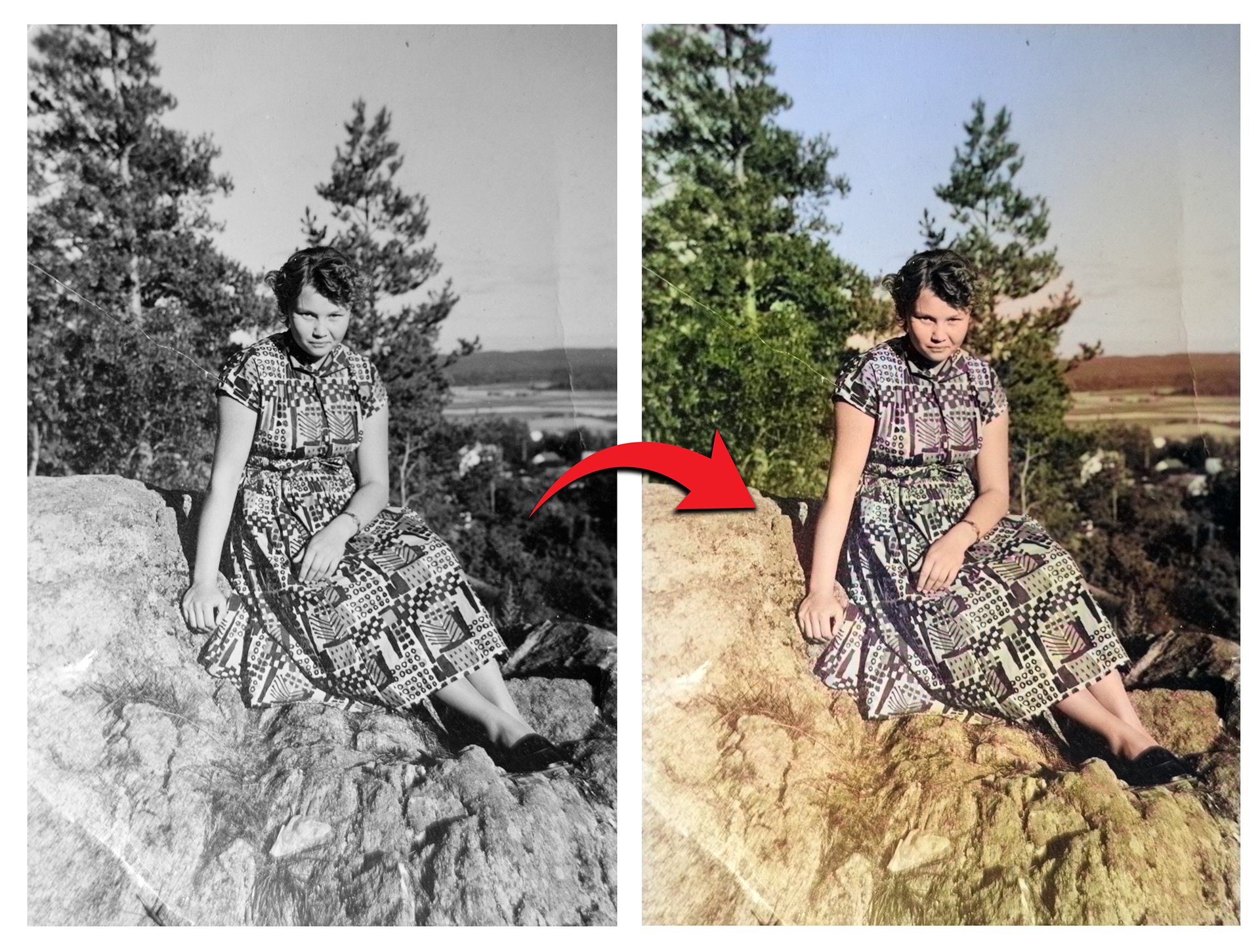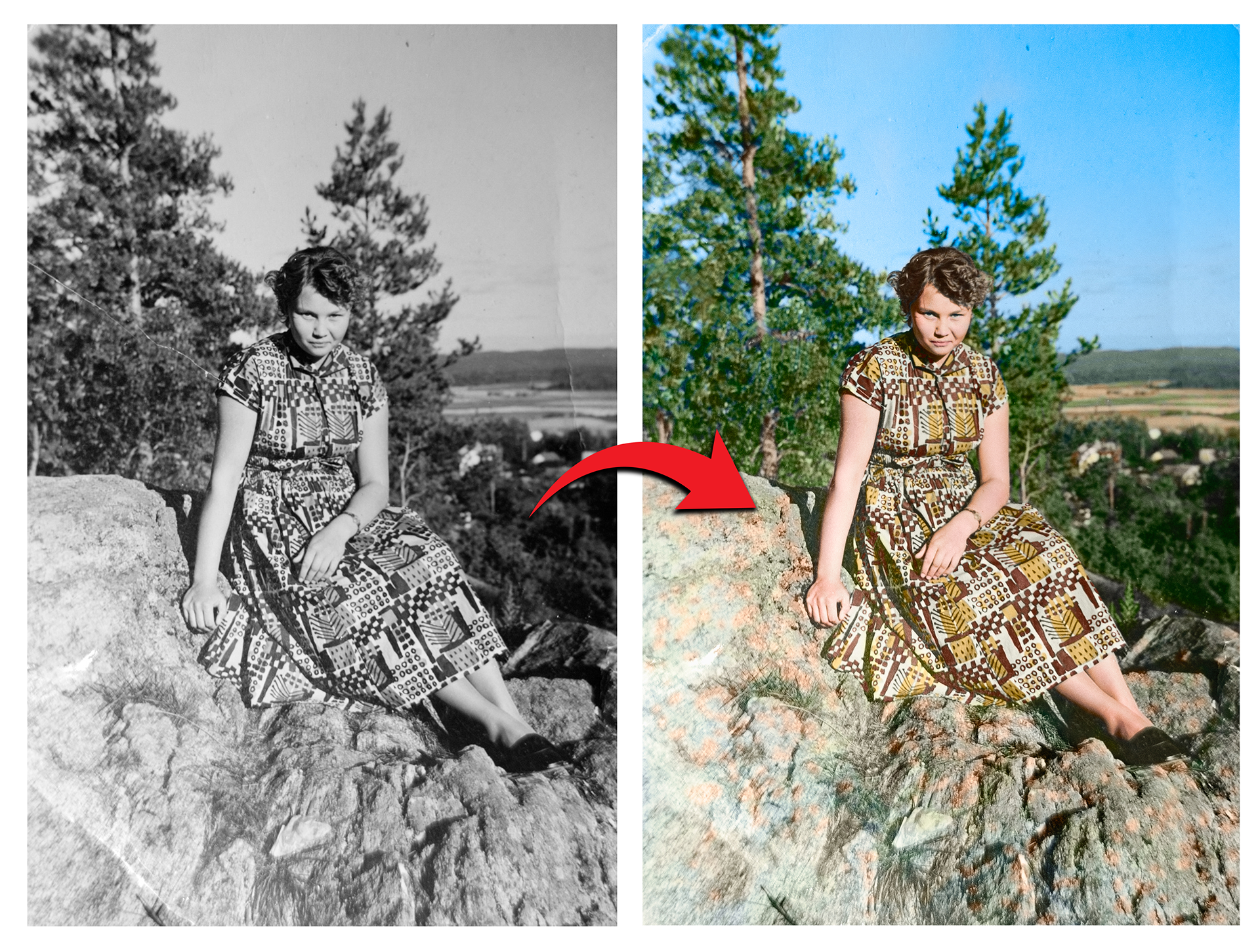 Sisältää mustavalkoisen valokuvan digitaalisen värityksen. Kuva väritetään Adobe Photoshopin tekoälyä käyttäen. Tekoäly komennetaan värittämään kuva kolme kertaa, josta valitsen parhaimman vaihtoehdon. Mahdollisuus myös yhdistää kuvan retusointiin, jossa kuvasta poistetaan tahrat, repeämät tai pöly.